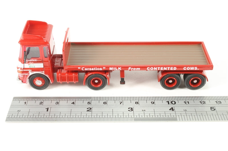 Our ERF LV Flatbed Trailer, registered BSN 38C, is all ready to take pallets of Carnation to wherever, decorated in red with white lettering with the Carnation logo printed in red white and green below the front windscreen of the cab and repeated on both the cab doors. The flatbed trailer features light brown planking and the red sides are printed with the famous brand strapline 'Carnation' Milk from Contented Cows. Silver masking enhances the wheels, wipers, door handles and mudguards and a final detail sees the Carnation name once more above the windscreen in silver out of black.